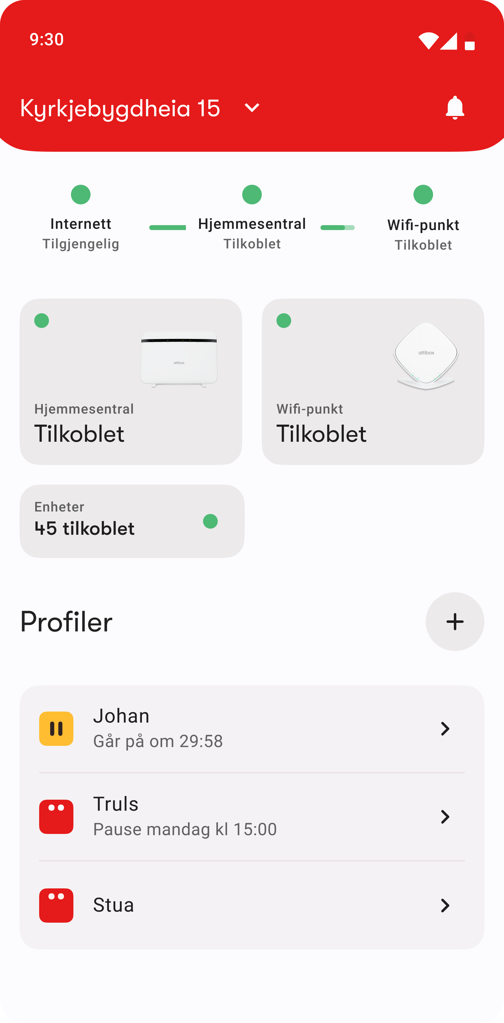 Altibox Hjem har mange smarte funksjoner. Her kan du se hovedsiden, oversikt over hvilke enheter koblet på hjemmenettet, og den mest populære funksjonen - foreldrekontroll.